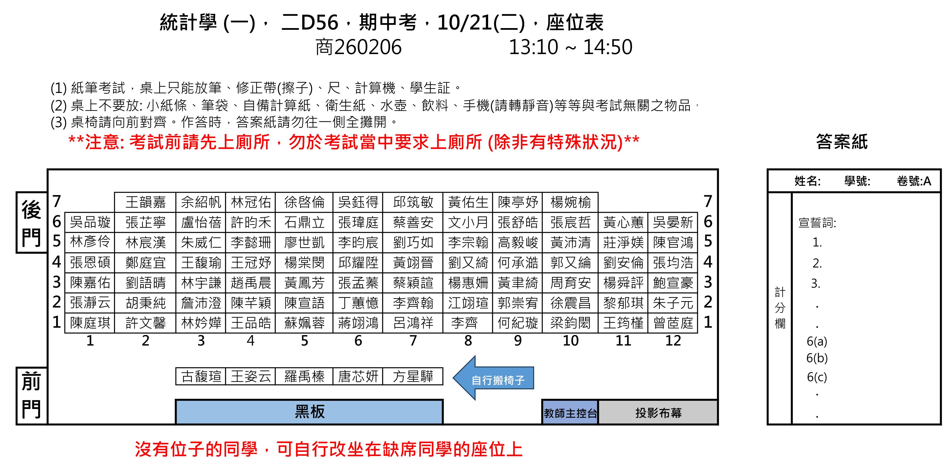 - 注意事項:(1) 正常上課時間為 13:10–14:40。(2) 請攜帶計算機(不得具備程式功能;最好具備開根號與對數功能)。(3) 禁止使用手機與筆電。(4) 座位表將於考試前 10 分鐘公布。 [座位表]